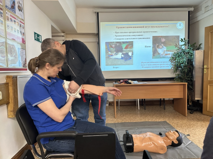 Следуя алгоритму, участники курса придавали «пострадавшему» оптимальное положение тела, проводили сердечно-легочную реанимацию на манекене «ГОША», останавливали «кровотечение» с помощью повязок, жгута и импровизированных жгутов, удаляли инородное тело из верхних дыхательных путей, используя прием Геймлиха.