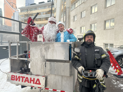На пожарных подъемниках наряженные в костюмы Дедов Морозов и Снегурочек сотрудники Департамента ГОЧСиПБ поднялись к окнам больницы, радостно приветствуя детей и их родителей, «взрывая» хлопушки и рисуя в воздухе руками сердечки.