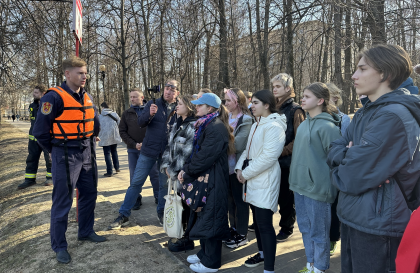 Ведущий инженер Управления Евгений Коростель обратил внимание ребят на установленные по периметру Екатерининского пруда запрещающие знаки «Выход на лед запрещен» с телефоном экстренной службы «112» и персональным номером знака и объяснил им, как нужно действовать при возникновении чрезвычайной ситуации на воде.