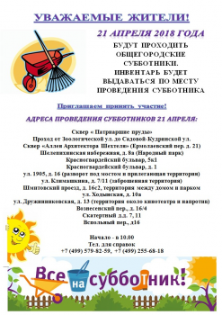 21 апреля в 10 : 00 ч. пройдут общегородские субботники. Инвентарь будет выдавать по месту проведения субботников.
